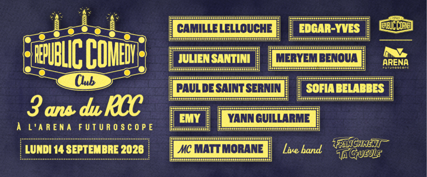Après deux premières éditions complètes, on ne pouvait pas s’arrêter là, vous commencez à nous connaître… Le lundi 14 septembre 2026, on remet le couvert pour les 3 ans du Republic Comedy Club qui s’annonce déjà mémorable.